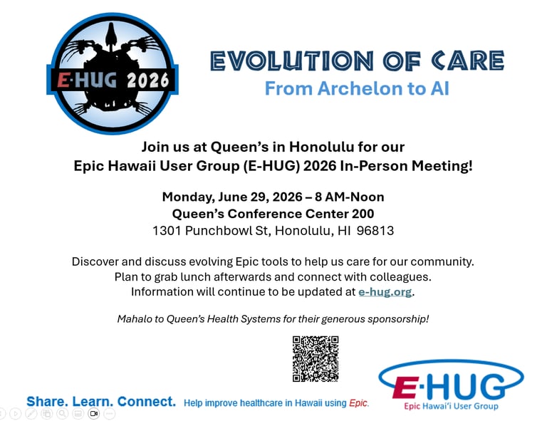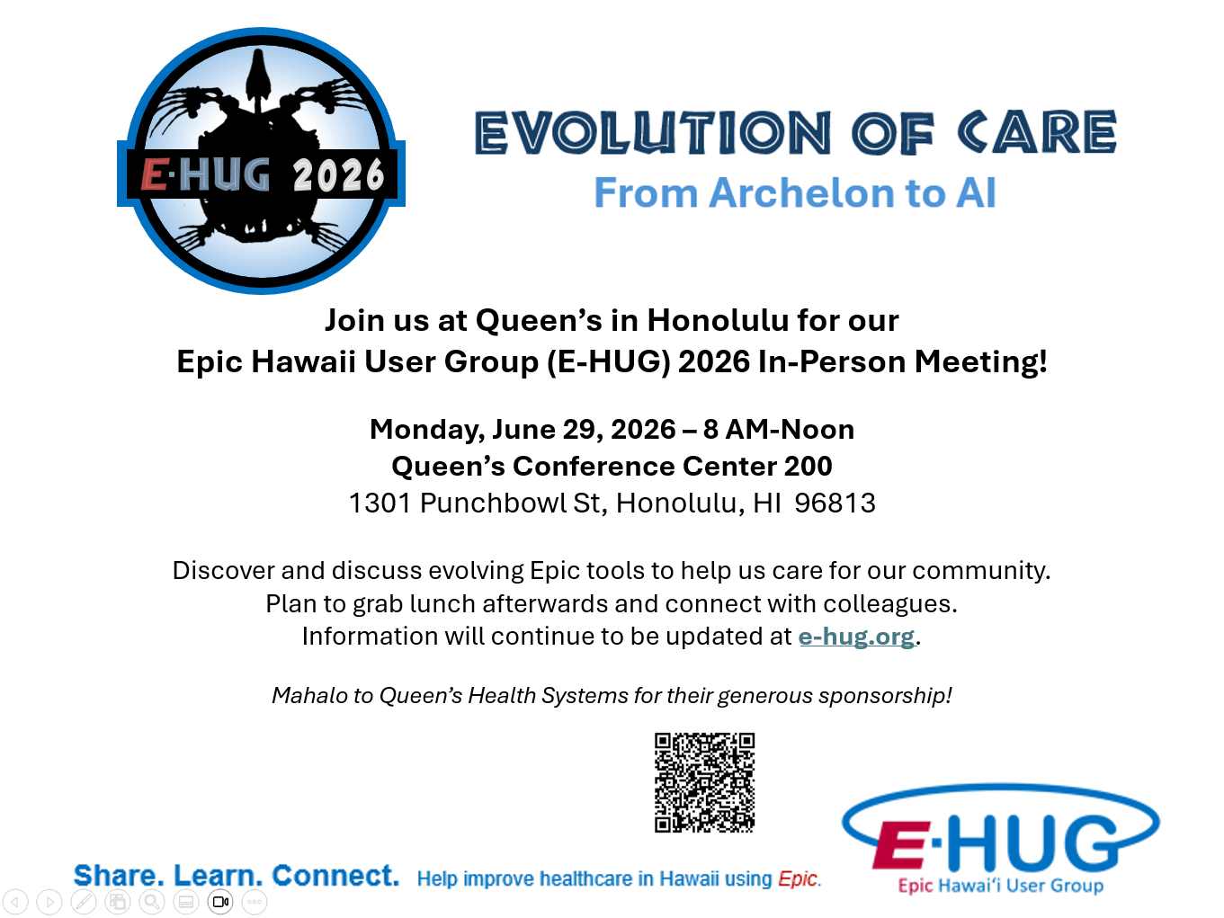 REGISTER for E-HUG 2026 Meeting at Queen's Monday 6/29/26 morning! Provider SmartUser classes 6/29/26 & 6/30/26 afternoons!