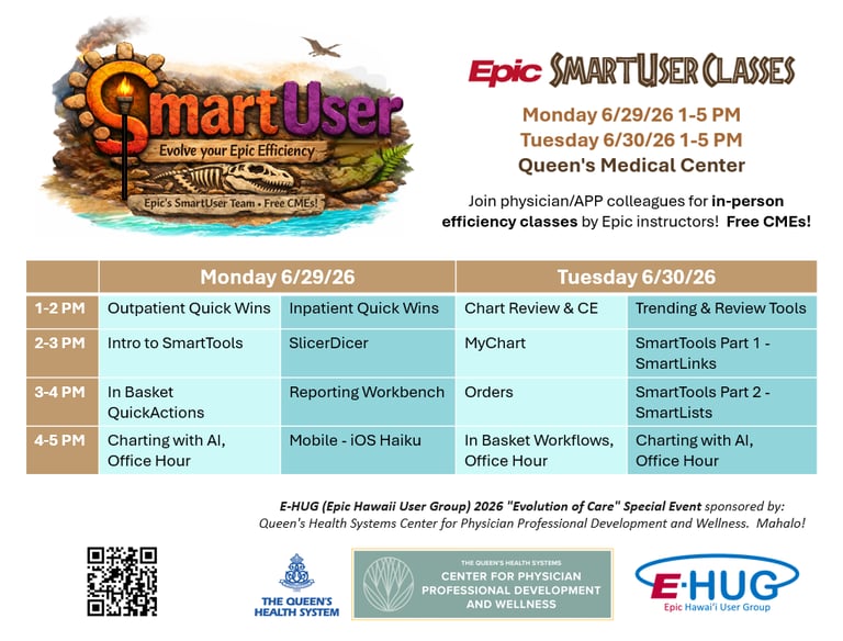 REGISTER for E-HUG 2026 Meeting at Queen's Monday 6/29/26 morning! Provider SmartUser classes 6/29/26 & 6/30/26 afternoons!